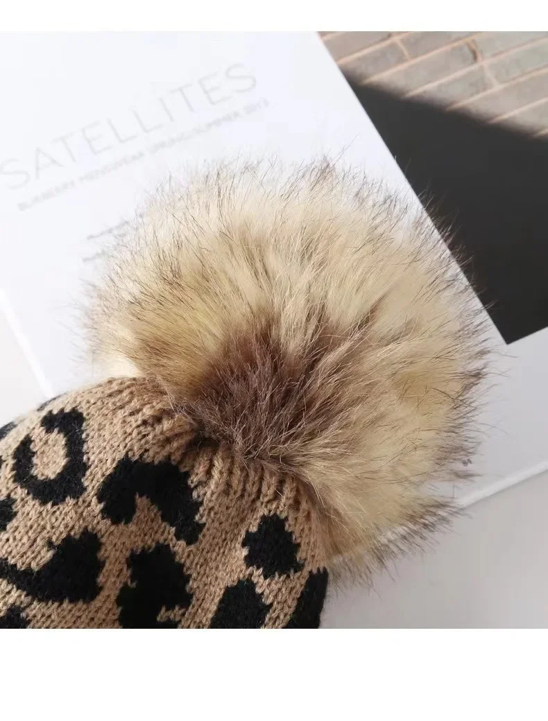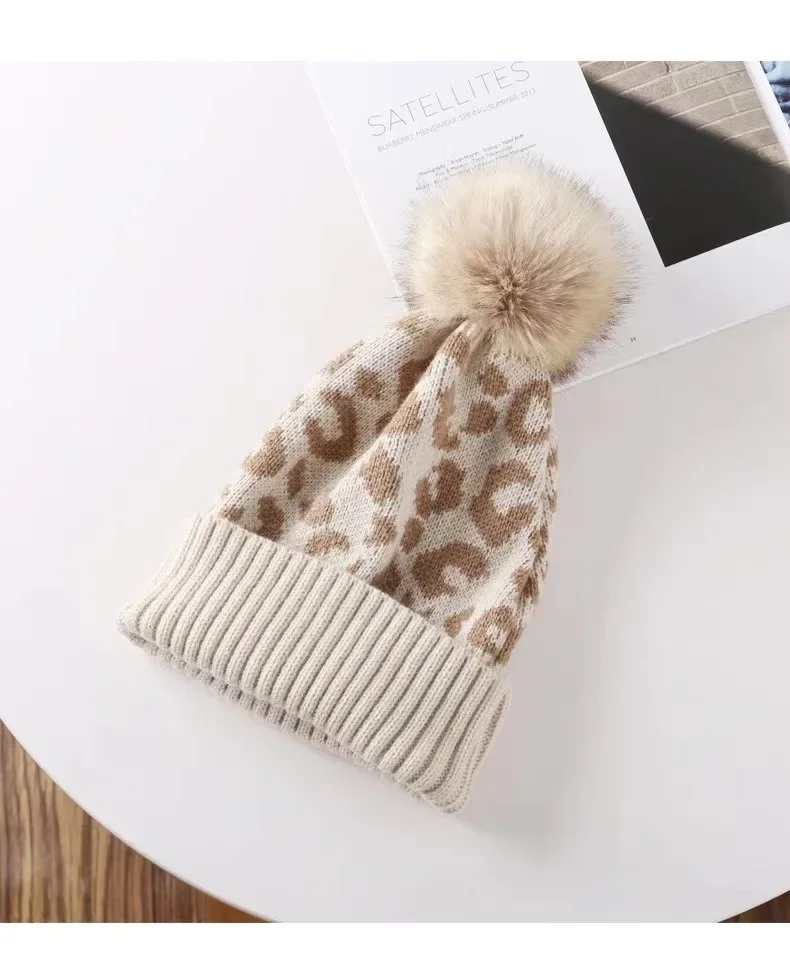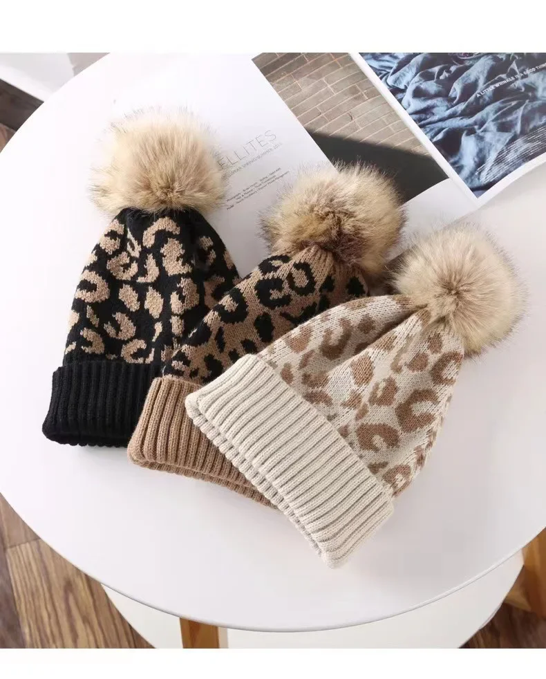 Bonnet Tricot Femme Noir Léopard Pompon